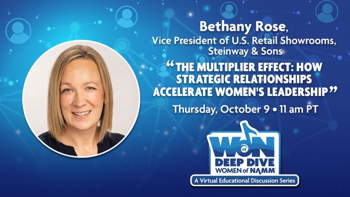 Join Women of NAMM (WoN), Thursday, October 9, 2025 at 11 am PT for their next installment of their bi-monthly Deep Dive Series featuring Bethany Rose, Vice President of US Retail Showrooms at Steinway & Sons, to discuss “The Multiplier Effect: How Strategic Relationships Accelerate Women’s Leadership.”